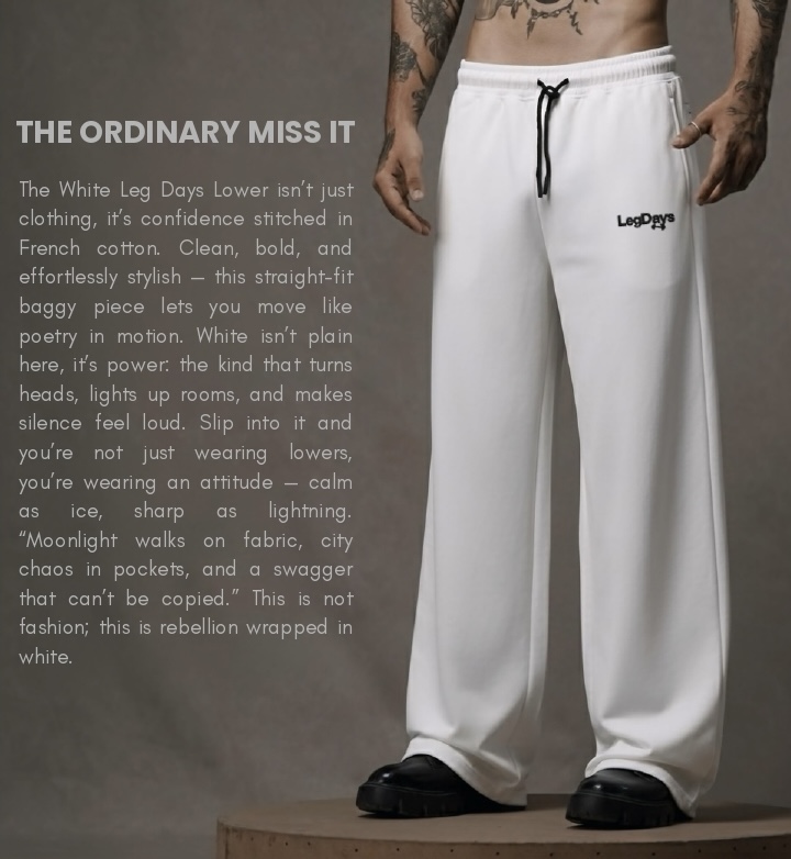 These White straight-fit Baggypants from LegDays are made from 350 GSM bio-washed pure cotton for unmatched comfort and structure. Designed with a relaxed silhouette, they’re thick enough to flex in the gym and drippy enough to wear out.